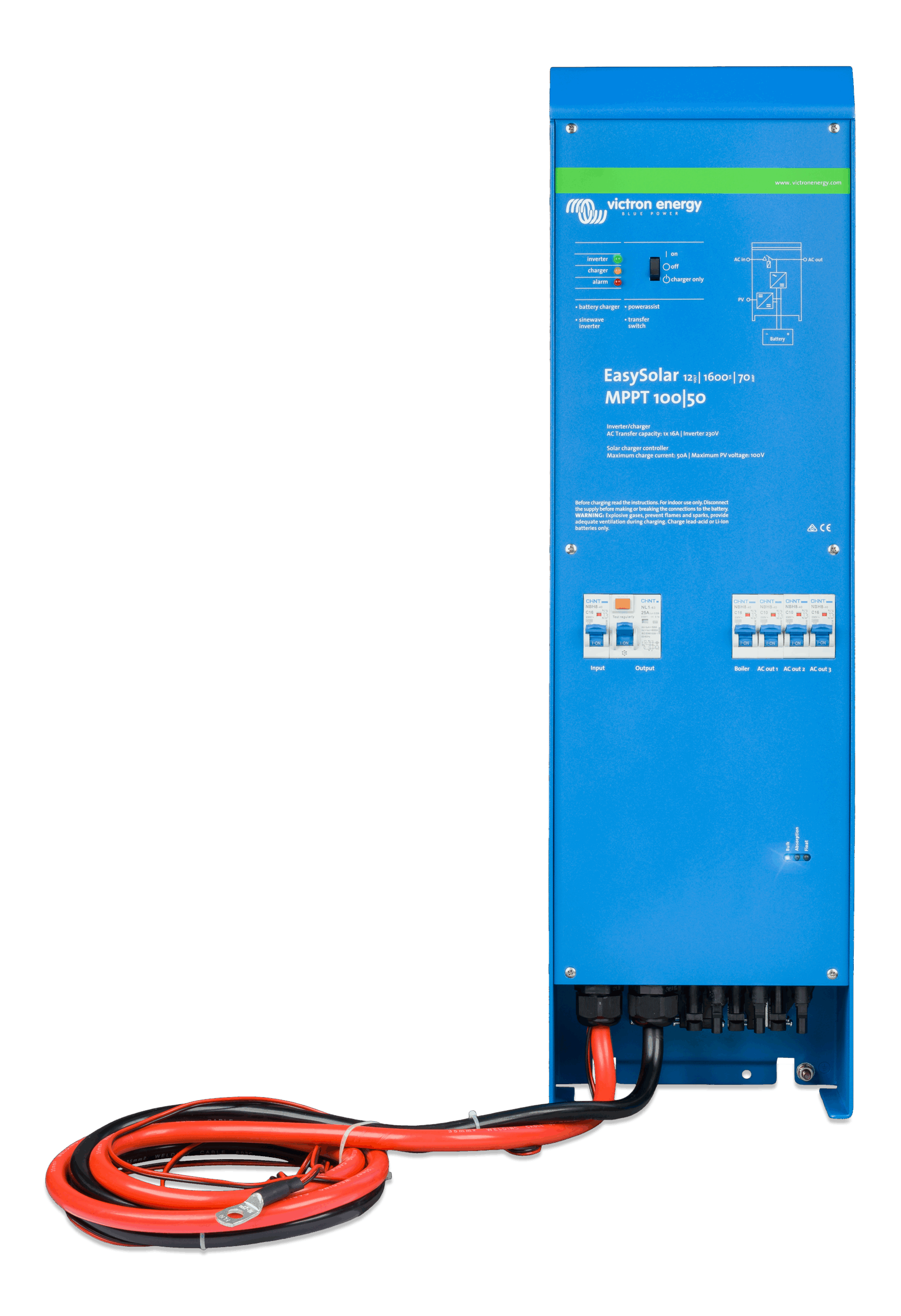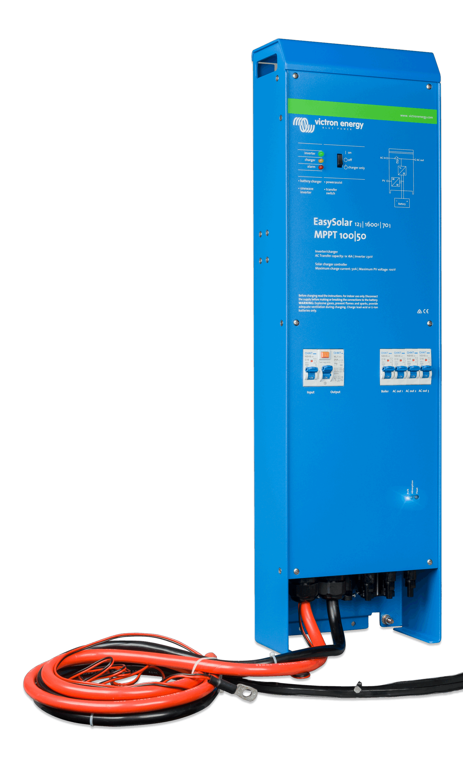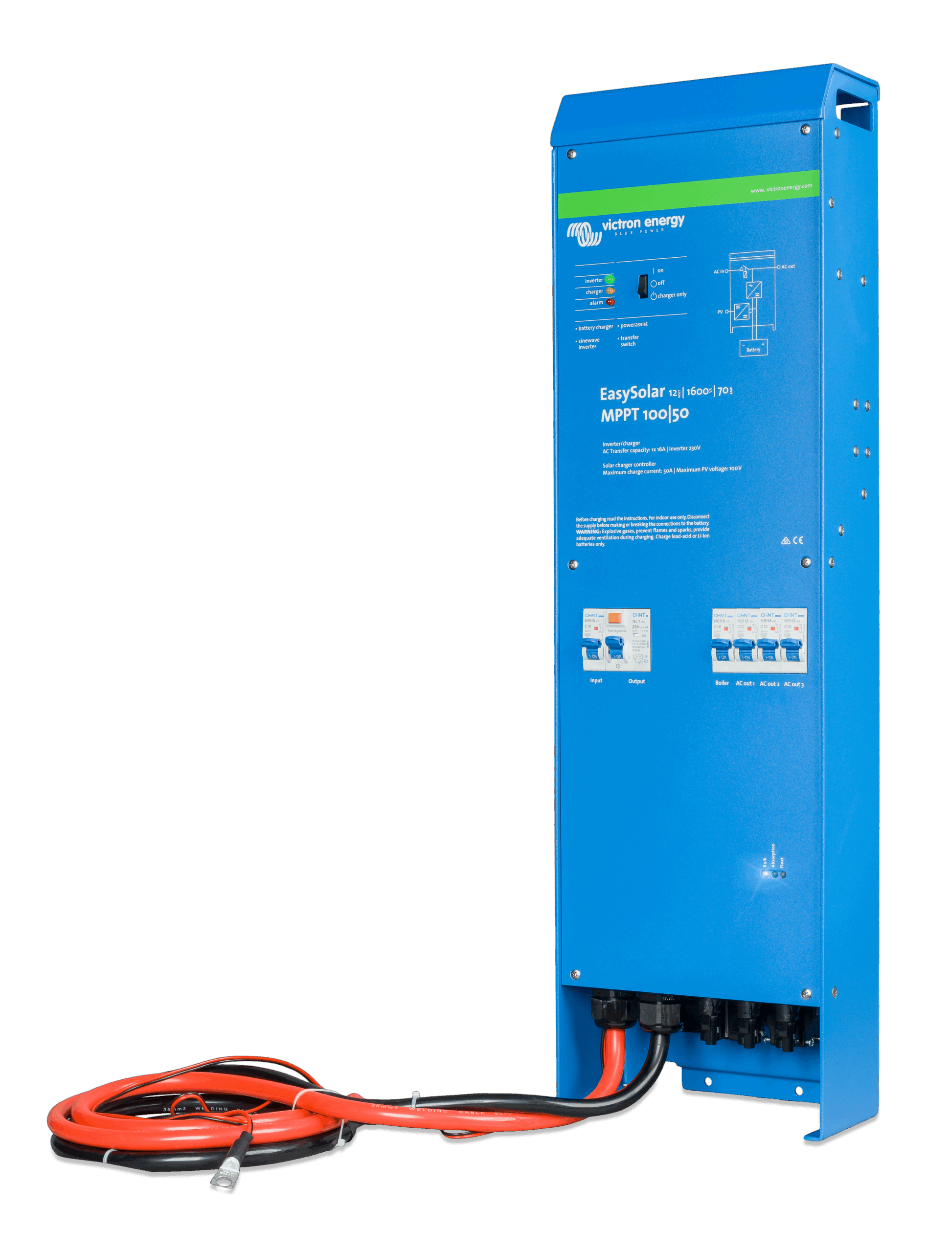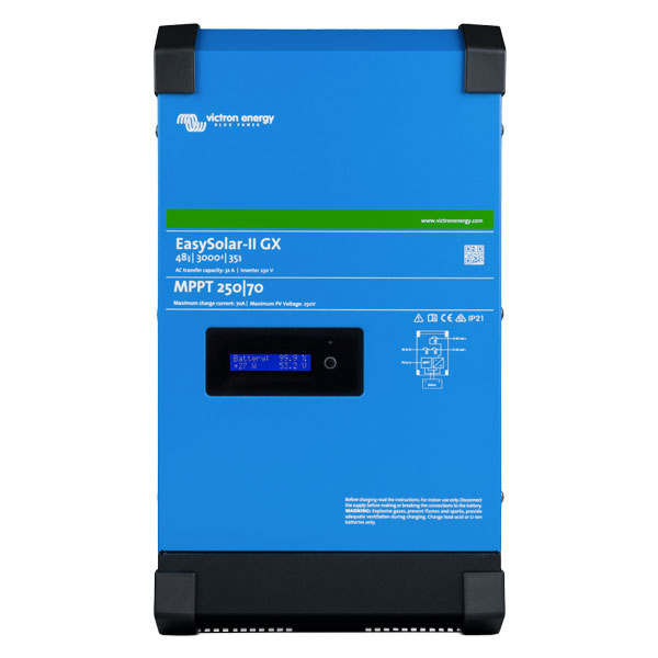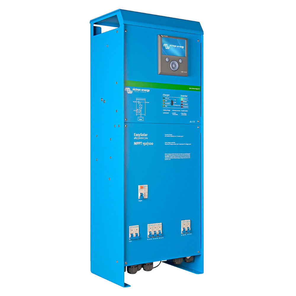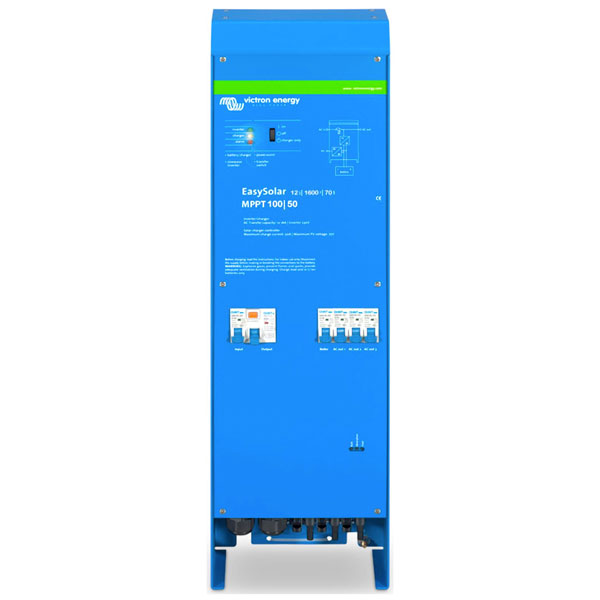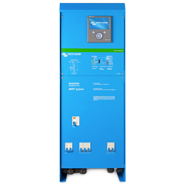 The EasySolar combines a MPPT Solar Charge Controller, an inverter/charger and AC distribution in one enclosure. The product is easy to install, with a minimum of wiring.
